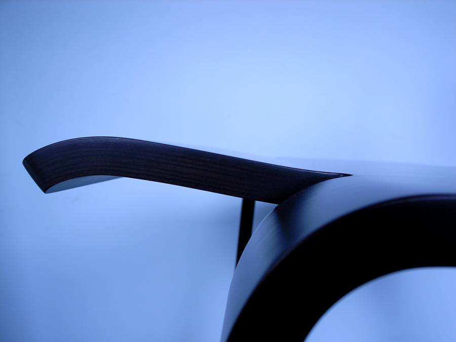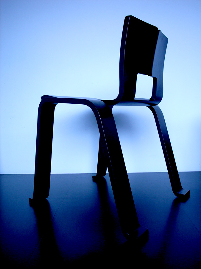 厚さ17mmの一枚の成形合板に切り込みを入れ、折り曲げられてできる小椅子。